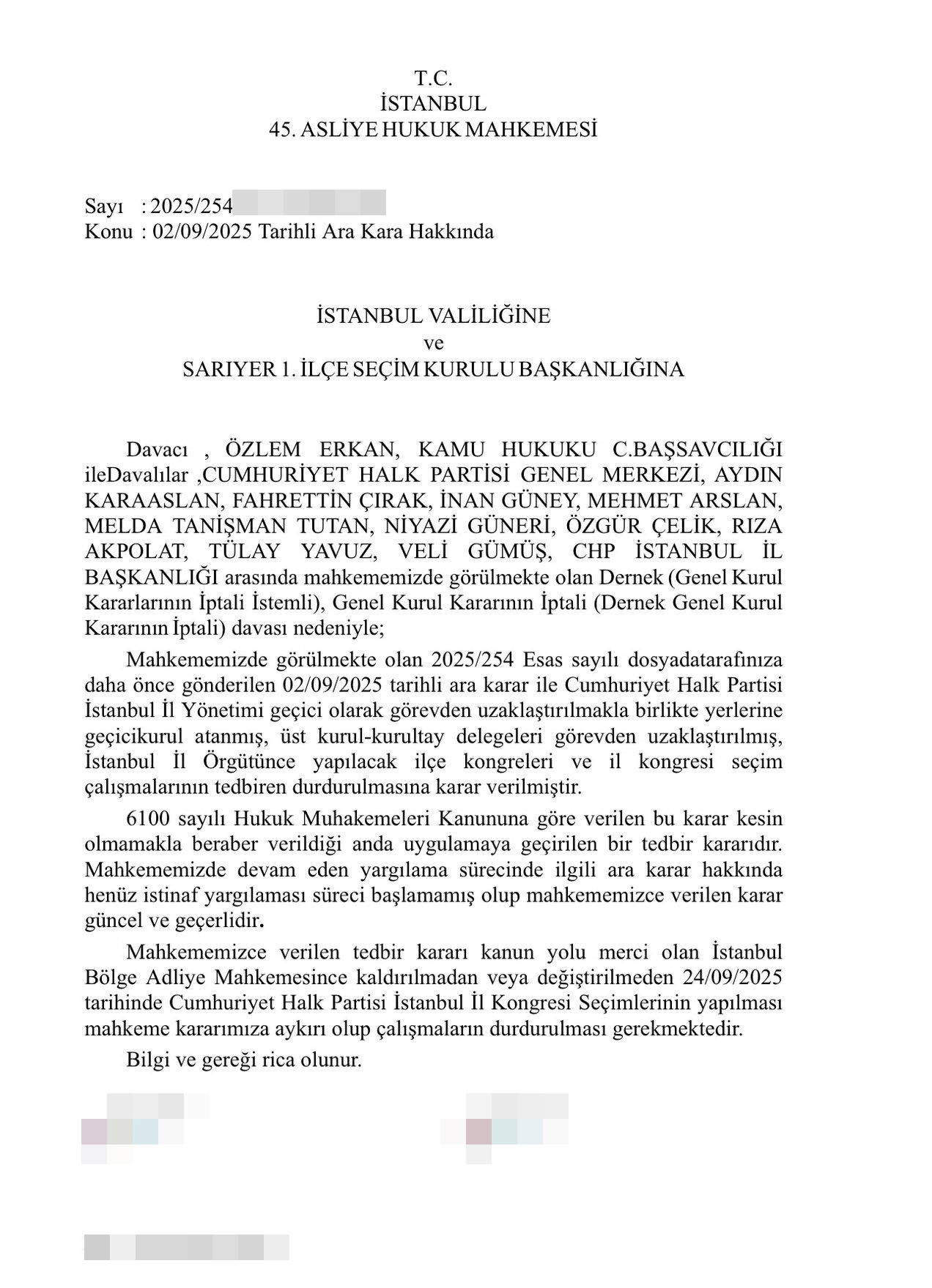 24 Eylül 2025 tarihli mahkeme yazısında, “Verilen tedbir kararı henüz istinaf yargılaması süreci başlamamış olup mahkememizce verilen karar güncel ve geçerlidir. Mahkememizce verilen tedbir kararı kanun yolu mercii olan İstanbul Bölge Adliye Mahkemesince kaldırılmadan veya değiştirilmeden 24/09/2025 tarihinde Cumhuriyet Halk Partisi İstanbul İl Kongresi Seçimlerinin yapılması mahkeme kararımıza aykırı olup çalışmaların durdurulması gerekmektedir” denildi.